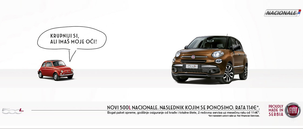 U pitanju je program lojalnosti namenjen lokalnom tržištu i domaćem proizvodu, modelu FIAT 500L koji se s ponosom proizvodi u Srbiji, u kragujevačkoj fabrici. Ponuda je namenjena svim potencijalnim kupcima koji su se opredelili da kupe novi FIAT 500L i tom prilikom ostvare dodatne pogodnosti kroz specijalne uslove kreditiranja Credit Agricole banke. Nacionale ponuda odnosi se na sve pakete opreme modela FIAT 500L - POP STAR, LOUNGE, CROSS i WAGON.