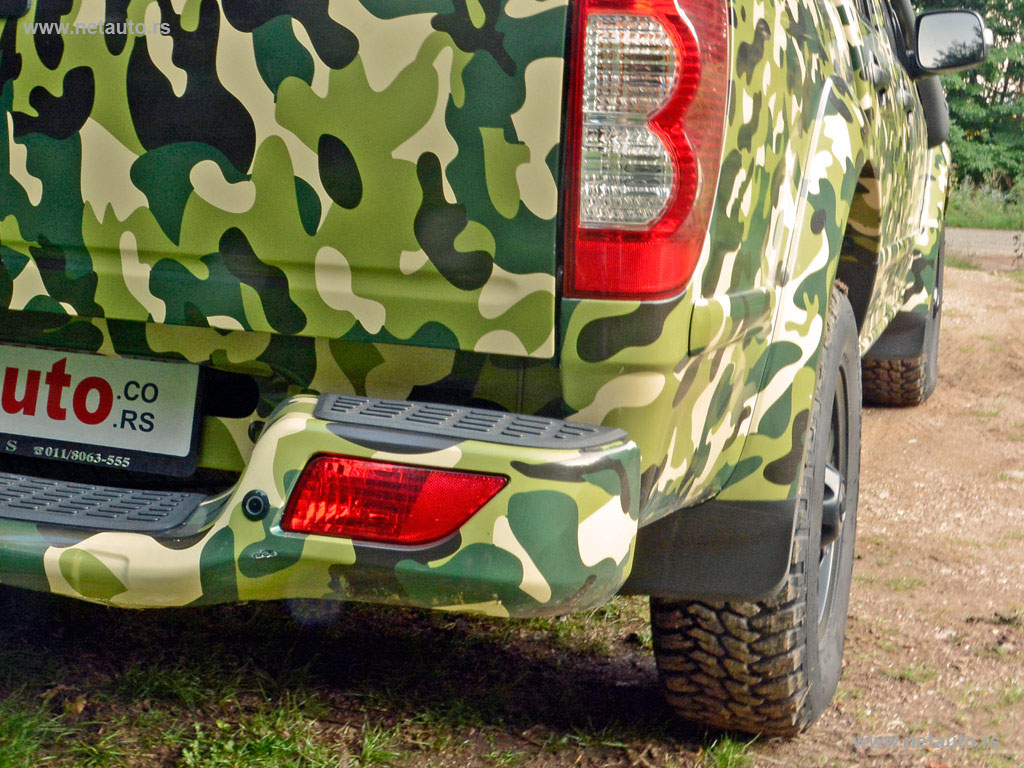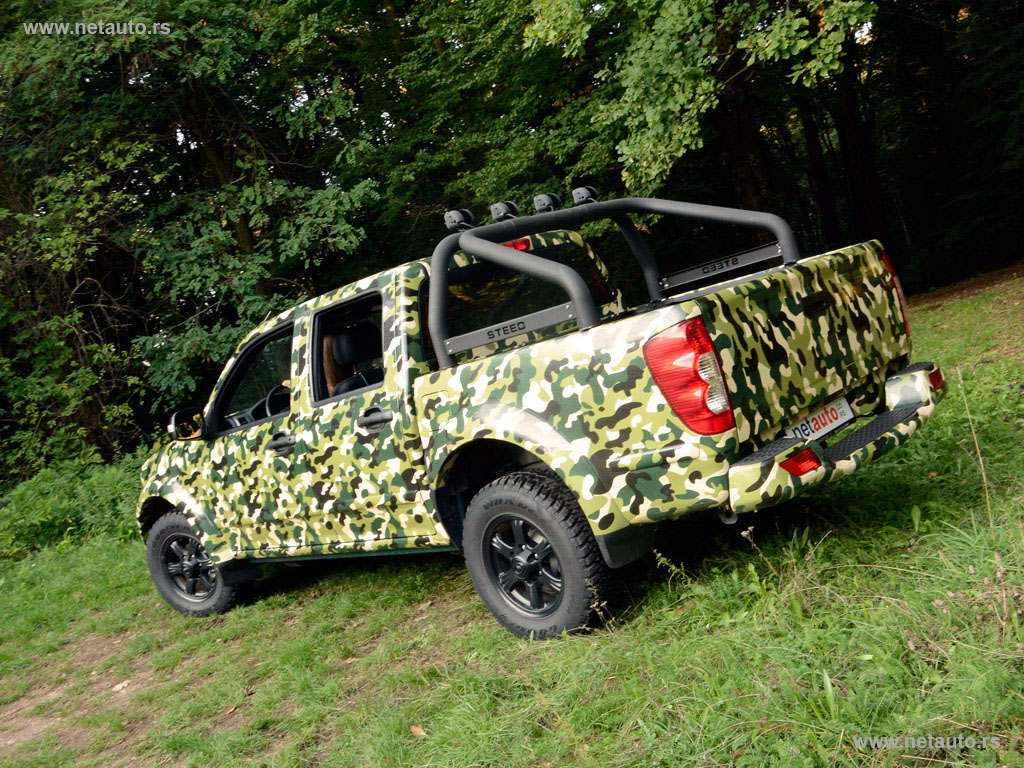 Zadnji kraj vozila očekivano je jednostavan: na njemu dominiraju velika vrata teretnog prostora koja zahtevaju odlučnu mušku ruku prilikom rukovanja, dok se na zadnjem braniku nalaze parking senzori. Na uglovima vozila nalaze se vertikalno postavljene stop lampe. Dizajnerima se mora odati priznanje za zaista uspešan rad, koji se ogleda u aktivnom izgledu koji nema dodira sa uvreženim predrasudama o obavezujućem izgledu kineskih vozila u mislima prosečno obaveštenih vozača i kupaca. Izuzetno bitni offroad detalji, kao i upadljiva maskirna folija činili su ovo vozilo još ozbiljnijim i nisu ostavljali mesta sumnji u vrednost Steed-a. Tokom testa često su nas pitali da li radi o vozilu jednog dalekoistočnog proizvođača zvučnijeg imena. Sve to nas je praktično uverilo da je izgled vozila definitivno „pogođen“ i da kupci neće imati priliku da se „stide“ porekla vozila.