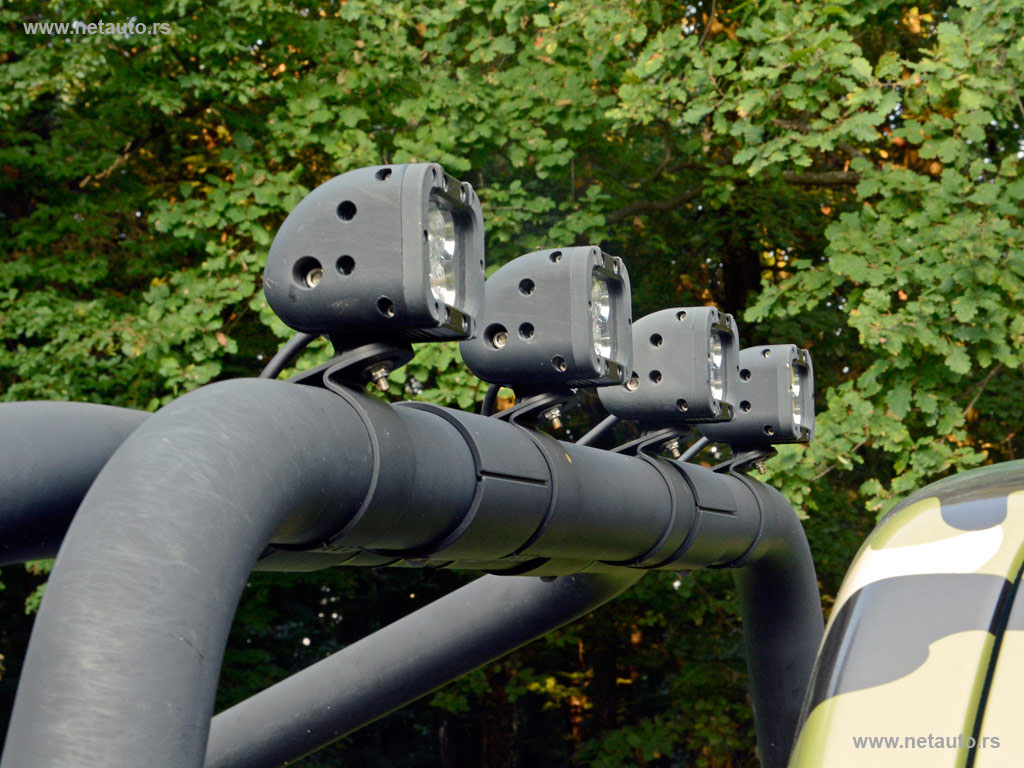 Pogled na bok otkriva pravilne i jednostavne linije, koje su uostalom i sasvim očekivane kod vozila ovog tipa. Naglašeni su lukovi prednjih i zadnjih točkova, dok masivni spoljni retrovizori ostavljaju utisak snage. Iza kabine, opet u vidu dodatne opreme, nalazi se „roll bar“, kao zaštita od prevrtanja u mat boji. Na njemu su inkorporirane maglenke u LED tehnologiji (ukupno četiri) koje služe za osvetljavanje prostora ispred vozila u uslovima noćne offroad vožnje.
