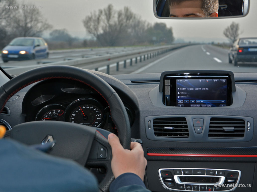 Ulazak u automobil je putnike na prednjim sedištima izuzetno za lako zahvaljujući velikim i ne preterano teškim vratima koja se široko otvaraju. Testirani automobil nosio je oznaku paketa GT line, što podrazumeva izuzetno bogatu opremu. Prednja sedišta su preuzeta od modela RS i izvedena su u kombinaciji platna i kože na bokovima, koji su ojačani i koji pružaju odličnu bočnu potporu prilikom iznenadnih manevara upravljačem, ali i u dugim i brzim krivinama. Zahvaljujući brojnim mogućnostima podešavanja sedišta, kao i stuba upravljača, vozač vrlo lako može da se smesti u idealan položaj. Ukoliko se sedište spusti u donji, najniži položaj, bočna i preglednost put nazad je narušena atraktivnim linijama coupea. Međutim, ukoliko se pravilno podesi sedište, vozač zaista neće imati izražene smetnje ove vrste.