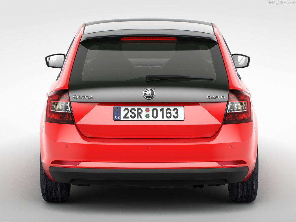 Iznad zadnjeg prozora, smešten je novi krovni spojler koji daje sportsku notu automobilu, a opcioni produženi i zatamljeni zadnji prozor se proteže od krova do ispod gornje ivice zadnjih svetosnih grupa. Ukupna dužina modela Škoda Rapid Spaceback je smanjena za 180 mm jer je skraćen zadnji deo i sada iznosi 4.483 mm, ali zato ponuda prostora u putničkoj kabini nije promenjena. Kada je reč o praktičnosti, treba napomenuti da ovaj karavan nudi zapreminu prtljažnika od 415 litara koja je zbog skraćenog zadnjeg dela smanjena sa 550 litara, odnosno 1.380 litara (smanjena sa 1.490 litara) kada je preklopljena zadnja klupa.